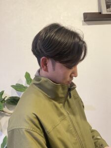 ワンカールのパーマスタイル。スタイリングもオイルを軽くつけるだけで毛流れを。